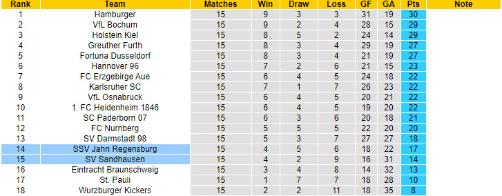Trong khi đó, Sandhausen là đội bất an hơn khi có được 14 điểm và xếp ở vị trí thứ 15. Lúc này, họ cũng chỉ hơn nhóm 3 đội cuối bảng đúng 1 điểm.