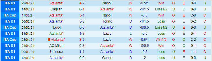 + Thống kê 10 trận gần nhất của Atalanta