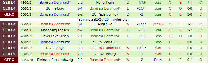 + Thống kê 10 trận gần nhất của Dortmund