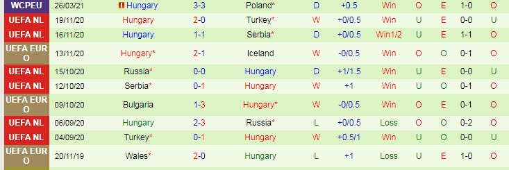 + Thống kê 10 trận gần nhất của Hungary