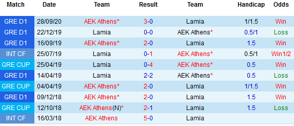 Từ đầu mùa, AEK Athens mới tích lũy được 42.86% số trận đáp ứng được lòng tin của nhà đầu tư trên thị trường. Tuy nhiên, đây lại là phong độ ấn tượng khi so sánh với Lamia mới có 3 trận thắng kèo sau 12 trận của họ.