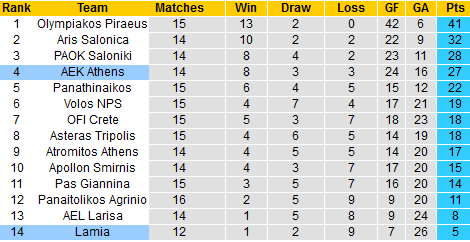 Qua 14 trận đầu tiên ở mùa giải năm nay, AEK Athens đang đứng thứ 4 và bị đội đầu bảng bỏ xa tới 14 điểm. Ngay cả khi tận dụng tốt trận đá bù còn lại, đại diện thủ đô vẫn kém tới 11 điểm.