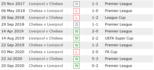 - Thống kê 10 lần đối đầu gần nhất giữa Liverpool vs Chelsea