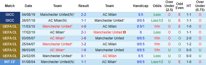 Hai lần gần nhất MU và AC Milan gặp nhau thuộc khuôn khổ giải giao hữu IC Cup. Kết quả hai trận đấu này đều khép lại với kịch bản bất phân thắng bại sau 90 phút (hoà 1-1 và 2-2). Trên chấm sút phạt luân lưu, Quỷ đỏ 2 lần giành chiến thắng.