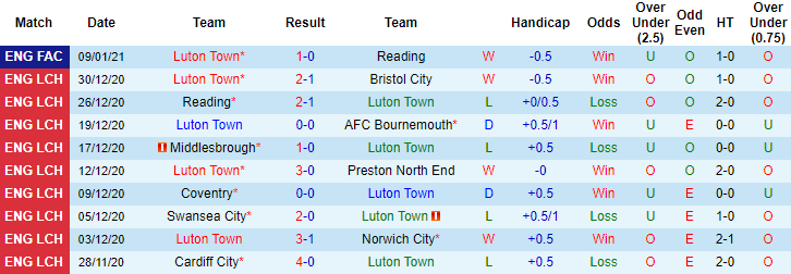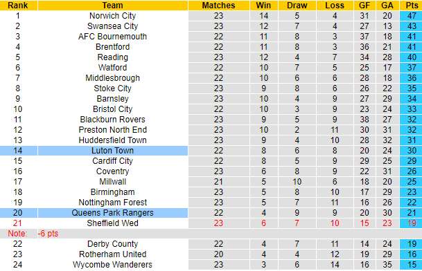 Sau 22 vòng đấu Luton Town đã giành được 30 điểm, xếp thứ 14 trên bảng xếp hạng. Trong khi đó QPR mới giành được 21 điểm sau 22 trận, xếp sau đối thủ 6 bậc. Giai đoạn gần đây Luton Town thi đấu vào phom nhờ lực lượng ổn định, 5 trận sân nhà vừa qua họ thắng 4, hòa 1 và toàn thắng theo kèo châu Á.