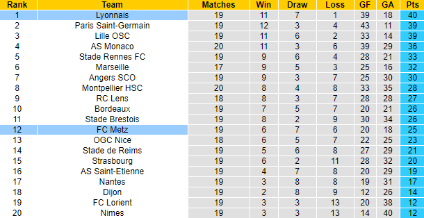 Metz sau 19 trận tại giải VĐQG Pháp mùa này giành 25 điểm, xếp ở vị trí thứ 12. Giai đoạn gần đây Metz cho thấy dấu hiệu sa sút, 3 trận liên tiếp vừa qua họ không biết đến mùi chiến thắng. Khả năng chặn đà thăng tiến của Lyon không thấy được ở Metz ở thời điểm hiện tại, đặc biệt là khi đội khách đang khủng khoảng lực lượng với 6 trụ cột dính chấn thương.