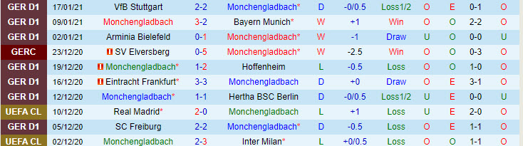 + Thống kê 10 trận gần nhất của M'gladbach