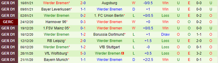 + Thống kê 10 trận gần nhất của Werder Bremen