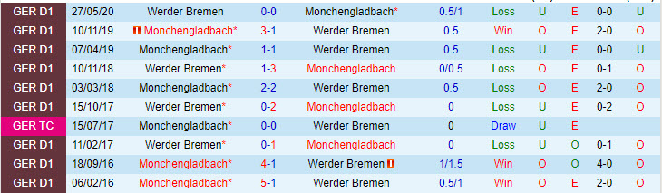 Nhưng nói đi cũng phải nói lại, Werder Bremen thường nhận những kết quả bất lợi mỗi khi chạm mặt M'gladbach trong những năm gần đây. Chi tiết, họ thua tới 6 và chỉ có được 4 trận hoà trong số 10 trận đối đầu vừa rồi. Riêng trên sân Borussia-Park của M'gladbach, Werder Bremen mới thắng có 2 trận, hoà 5 và thua tới 10 lần ở 17 trận đối đầu vừa rồi.