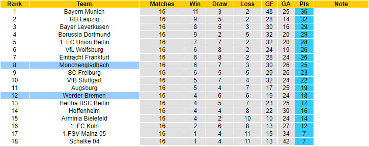 Phong độ và thống kê đối đầu M'gladbach - Werder Bremen gần đây: