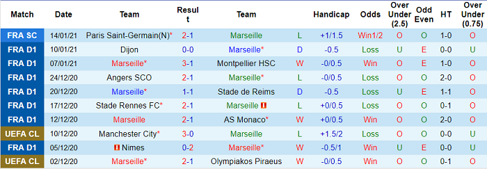 Kết quả màn so tài thuộc khuôn khổ vòng 19 Ligue 1 mùa 2020/21 giữa Marseille và Nimes tương đối dễ đoán: chiến thắng dành cho Marseille.