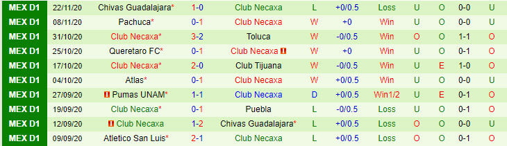 + Thống kê 10 trận gần nhất của Club Necaxa