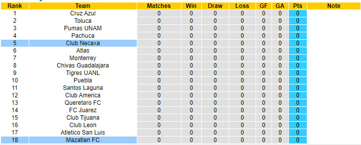 Sáng mai, Club Necaxa có trận mở màn lượt với chuyến hành quân tới sân của Mazatlan. Công tâm, đây là cơ hội tốt để đội bóng của HLV J. Cruz tìm kiếm 3 điểm. Nhắc lại, Mazatlan là đội bóng mới được thành lập và đây cũng chỉ là mùa giải đầu tiên họ có mặt tại giải VĐQG.