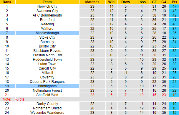13 lần đối đầu Birmingham trước đó trên sân nhà, Middlesbrough thắng 10, hòa 2 và chỉ để thua 1 trận. Birmingham sau 23 trận đấu tại Championship mùa này mới giành được 23 điểm, xếp thứ 19 trên bảng xếp hạng. 7 trận liên tiếp gần đây Birmingham không biết đến mùi chiến thắng với thành tích cụ thể là 6 thất bại và 1 trận hòa.