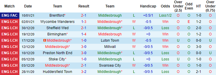 + Thống kê 10 trận gần nhất của Middlesbrough