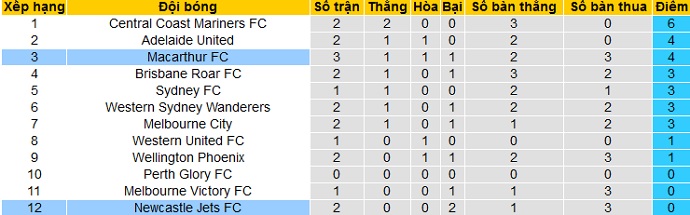 Bảng xếp hạng giải VĐQG Úc trước vòng 4
