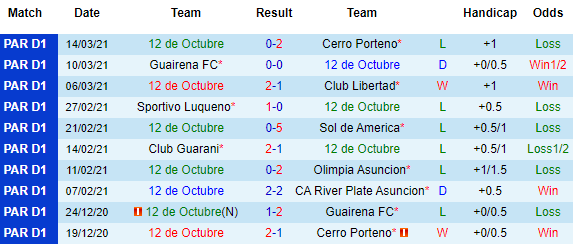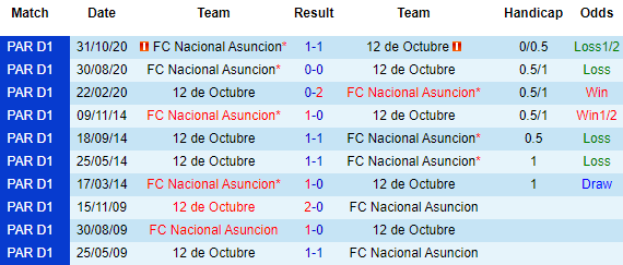 + Soi tỷ lệ kèo châu Á: Màn trình diễn của 12 de Octubre thất vọng ngay cả khi họ được thi đấu trên sân nhà. 3/4 lần tiếp khách gần đây 12 de Octubre thua kèo châu Á, trong khi Nacional Asuncion cho thấy sự khởi sắc với 3 trận liên tiếp chinh phục thành công rào cản tỷ lệ.