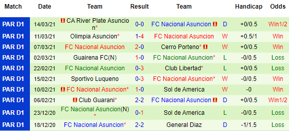 + Thống kê 10 trận gần nhất của Nacional Asuncion