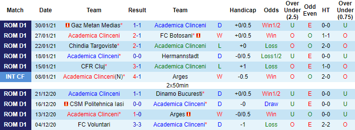 + Thống kê 10 trận gần nhất của Academica Clinceni
