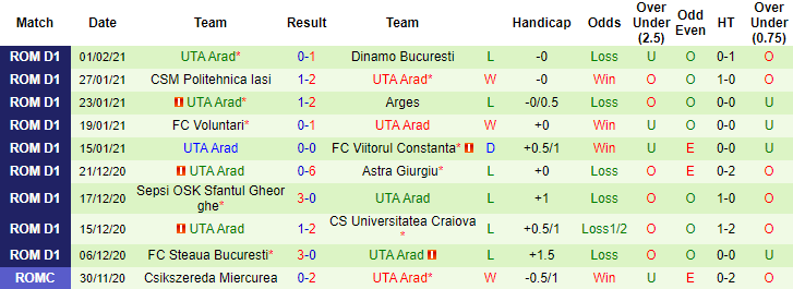 + Thống kê 10 trận gần nhất của UTA Arad