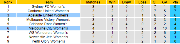 Adelaide Utd (W) cho thấy họ xứng đáng được tin tưởng với chiến thắng thắng 3 trận sân nhà liên tiếp gần đây. Trong khi đó sau 4 trận ở giải VĐQG nữ Úc mùa này, Melbourne City (W) đã để mất điểm tới 3 lần (thua 2, hòa 1). Trên bảng xếp hạng, Melbourne City (W) đang xếp dưới Adelaide (W) 3 bậc.