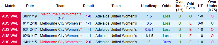 Adelaide Utd (W) luôn phải xếp chiếu dưới khi đối đầu Melbourne City (W). Những lần chạm trán Melbourne City (W) trước đây, Adelaide Utd (W) được chấp từ +1/2 đến 2 theo kèo châu Á. Thế nhưng tỷ lệ thắng kèo của Melbourne City (W) trong các trận đối đầu là 0% (thua 4, hòa 1 trên 5 trận).