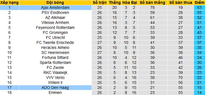 Trong khi đó Den Haag lại chỉ đang đứng áp chót trên bảng xếp hạng của giải đấu. Với 15 điểm có được sau 26 vòng đấu, Den Haag đang có bằng điểm với đội bét bảng Emmen và đang còn kém nhóm các đội trụ hạng tới 7 điểm.