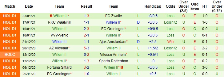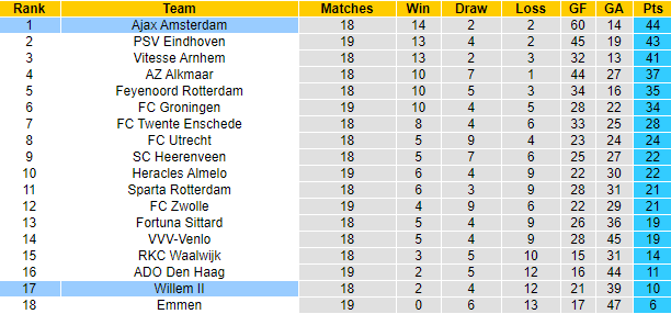 Sau 18 vòng đấu, Ajax đã giành được 44 điểm, dẫn đầu bảng xếp hạng. Với số trận tương tự, Willem II mới giành được 10 điểm, xếp ở vị trí thứ 2 từ dưới lên. Điều khiến Willem II khó hứa hẹn vào khả năng thắng kèo là do sự yếu kém của chính họ. 10 trận liên tiếp vừa qua, Willem II bất thắng với 8 thất bại, 2 trận hòa, thua 9 trận theo kèo châu Á.