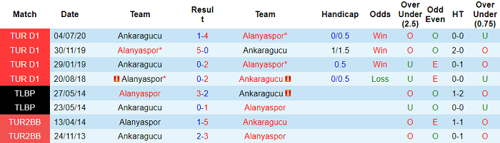 Thật vậy, Ankaraguku thua cả 4 lần so tài gần nhất thuộc khuôn khổ Super Lig với Alannyaspor. Cả 4 thất bại vừa rồi của Ankaraguku trước Alannyaspor đều có cách biệt từ 2 bàn trở lên.