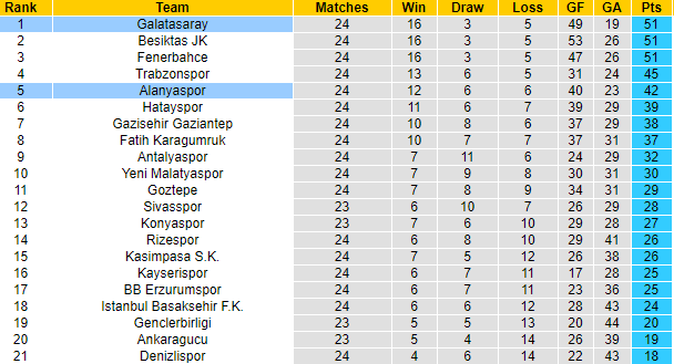 Galatasaray đang tạo ra cuộc chiến hấp dẫn đến chức vô địch. Dù dẫn đầu nhưng họ chỉ hơn 2 kình địch Besiktas và Fenerbahce ở chỉ số phụ. Làm khách trước Alanyaspor vào thời điểm này là điều khó khăn cho Galatasaray khi đối phương thường chơi tốt trên sân nhà.