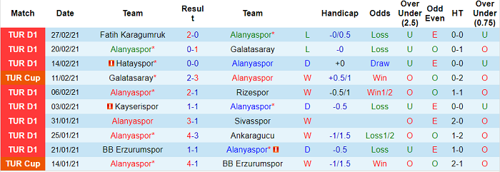 - Thống kê 10 trận gần nhất của Alanyaspor