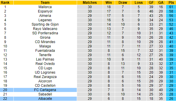Nhưng trước mắt còn tới 13 trận để Albacete có thể hiện thực hóa hy vọng trụ hạng. Cách biệt 4 điểm chẳng hề nhỏ ở đấu trường mà sự phân cấp thấp như Segunda, nhưng không phải là không thể san lấp. Đối thủ của Albacete trận này là Cartagena, đội bóng cũng đang trong khu vực cầm đèn đỏ.