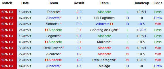 + Thống kê 10 trận gần nhất của Albacete