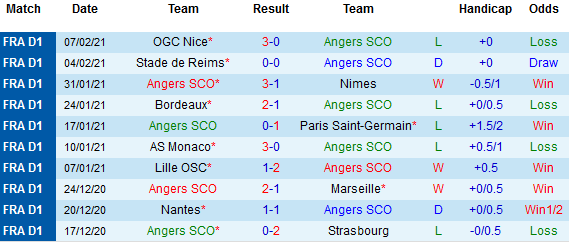 + Thống kê 10 trận gần nhất của Angers