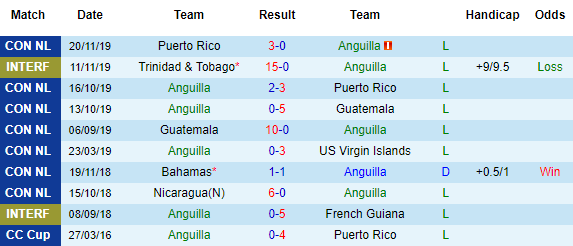 + Soi tỷ lệ kèo châu Á: Chênh lệch về trình độ giữa 2 đội là quá lớn và lần gặp nhau gần nhất Anguilla cũng thua tới 0-10. Tính ra thì 4 lần đối đầu mới đây, Anguilla toàn thua, không ghi được bàn nào nhưng thủng lưới tổng cộng 22 lần.