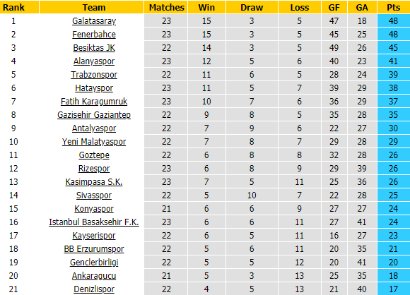 Trong khi đó, Sivasspor mùa này cũng chơi không tốt và chỉ giành được 25 điểm/22 trận. Sivasspor cũng chưa mang đến sự yên tâm cho NHM, bởi khoảng cách giữa họ và đối thủ cầm đèn đỏ gần nhất chỉ là 4 điểm, cách biệt vẫn có thể vượt qua khi còn tới nửa chặng đường phía trước.