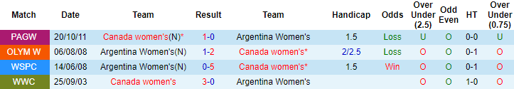 Cụ thể, 4 lần chạm trán Argentina (W) trong quá khứ, Canada (W) toàn thắng, ghi 11 bàn và chỉ 1 lần để thủng lưới. Dẫu vậy ở lần tái đấu sắp tới, Argentina (W) lại mang đến nhiều hứa hẹn vào khả năng thoát thua.
