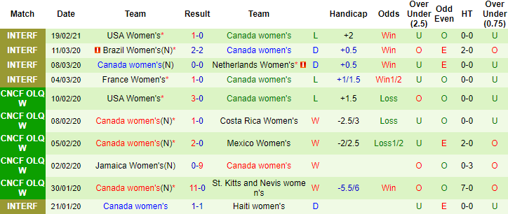 + Thống kê 10 trận gần nhất của Canada (W)