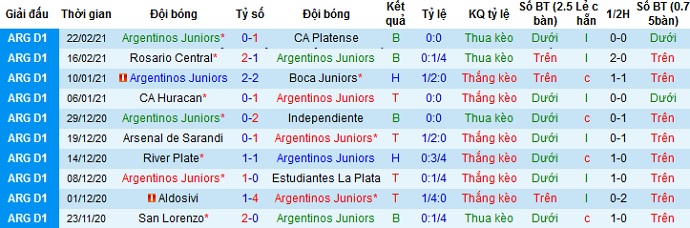 + Thống kê 10 trận gần nhất của Argentinos Juniors