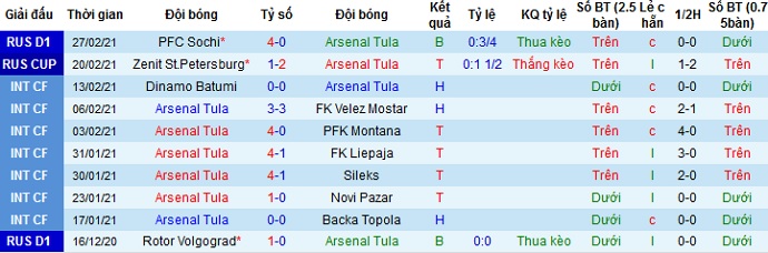 + Thống kê 10 trận gần nhất của Arsenal Tula