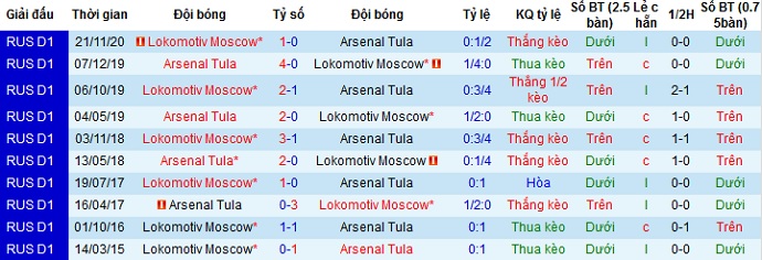 + Lịch sử đối đầu Arsenal Tula vs Lokomotiv Moscow