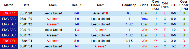 Phong độ và thống kê đối đầu Arsenal vs Leeds