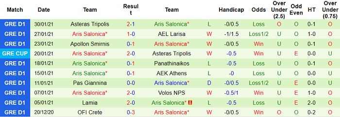 - Thống kê 10 trận gần nhất của Aris Salonica