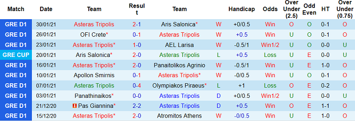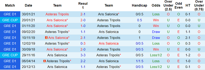Tuy nhiên, đây cũng là chiến thắng duy nhất của Asteras Tripolis trước Aris Salonica sau 6 lần so tài gần nhất trên mọi đấu trường. 5 trận còn lại, Aris Salonica bất bại và thắng tới 4 trong số này.