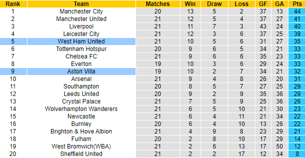 Aston Villa sau 19 trận tại giải Ngoại hạng Anh mùa này giành 32 điểm, xếp thứ 9 trên bảng xếp hạng. Trong khi đó West Ham đang xếp ở vị trí thứ 5 với 35 điểm nhưng đã đá 21 trận. Nếu thắng cả 2 trận đấu bù, Aston Villa lúc này đang xếp trên West Ham 1 bậc với khoảng cách 2 điểm. Vì vậy trận đấu sắp tới, Aston Villa được đánh giá cao hơn đối thủ là điều dễ hiểu.