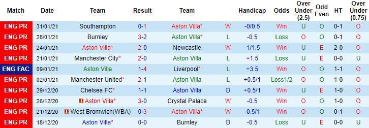 + Thống kê 10 trận gần nhất của Aston Villa