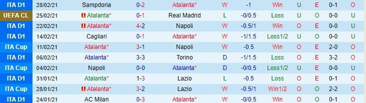 + Thống kê 10 trận gần nhất của Atalanta