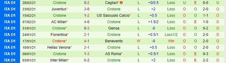 Bên kia sân, Crotone là tập thể xếp cuối cùng trên BXH với chỉ 3 trận thắng, hòa 3 và nhận tới 18 trận thua sau 24 lượt trận. Với phong độ hiện tại, NHM dự đoán Crotone sẽ nhận một thất bại với tỷ số cách biệt.