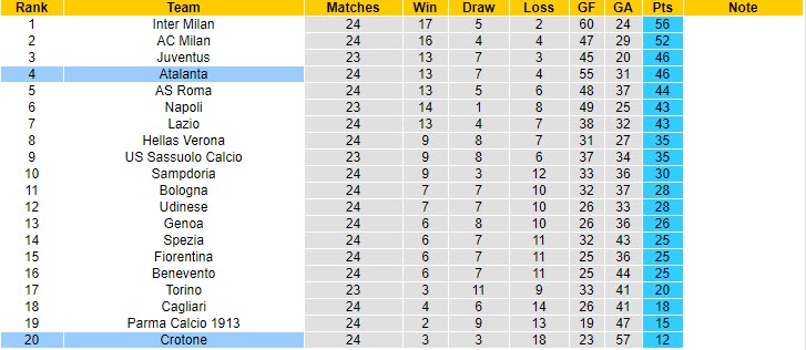 Cần nhớ, đội khách Crotone đang là tập thể sở hữu số bàn thua cao nhất giải với 57 bàn thua. Bên kia sân, Atalanta lại là một trong hai tập thể có hàng công hiệu quả nhất giải đấu khi ghi 55 bàn thắng – chỉ sau thành tích 60 bàn của Inter Milan.
