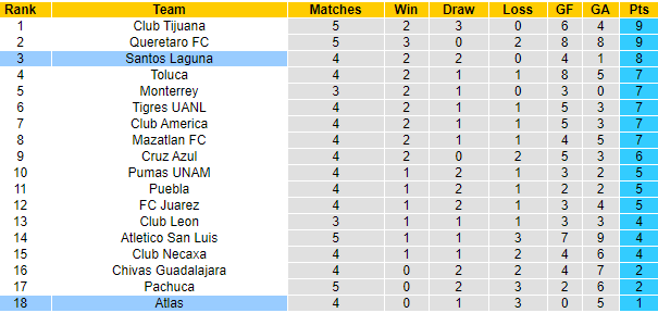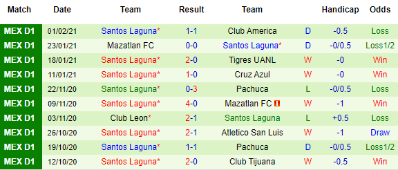 Trong khi đó, Santos Laguna lại chơi khá tốt với 4 vòng bất bại, trong đó có 2 chiến thắng. Họ đang nằm trong top 4 và cần giữ vững thứ hạng ở nhóm này. Đụng độ với đối thủ bét bảng, lẽ dĩ nhiên là NHM Santos Laguna chờ đợi vào một chiến thắng cho đội bóng con cưng.